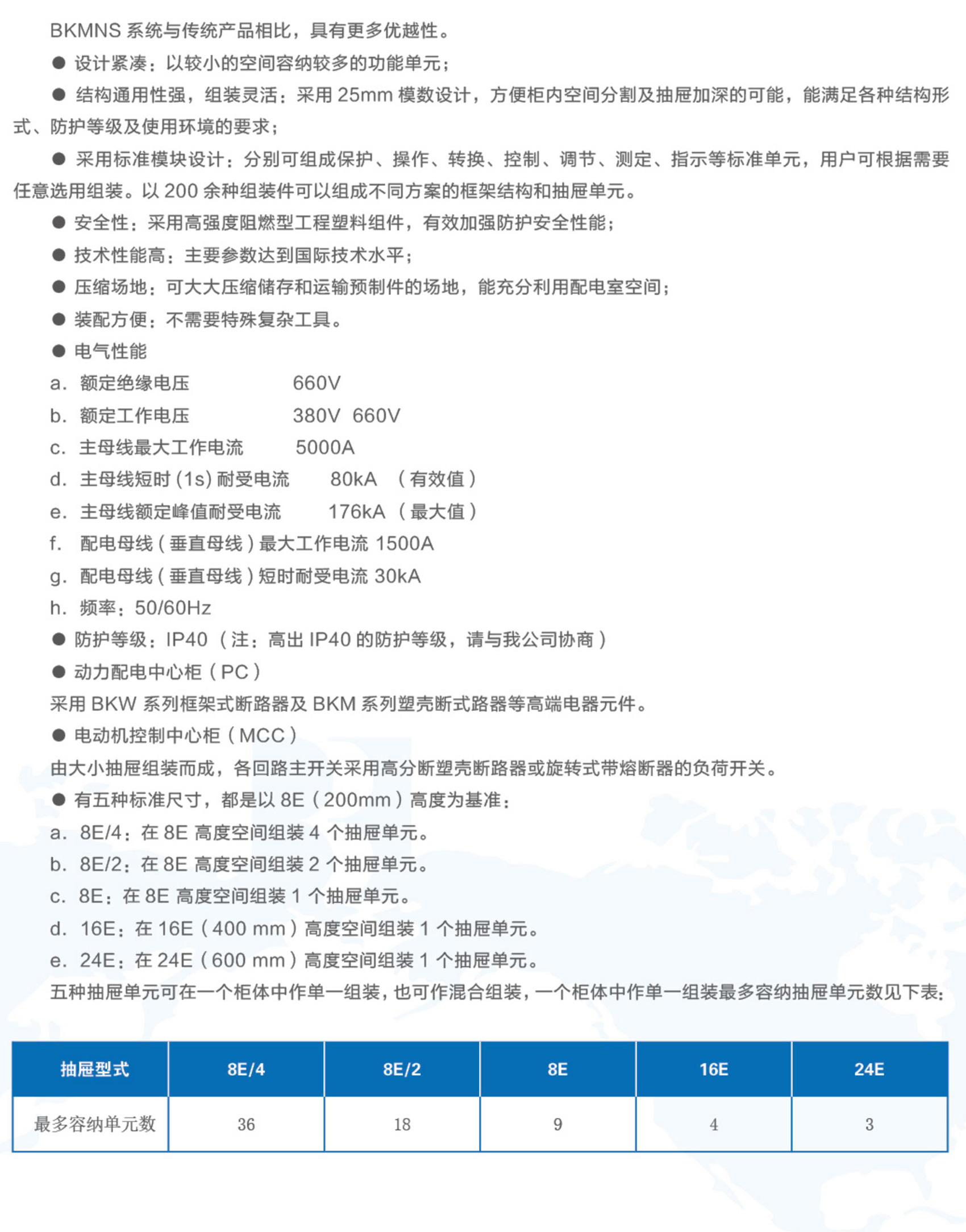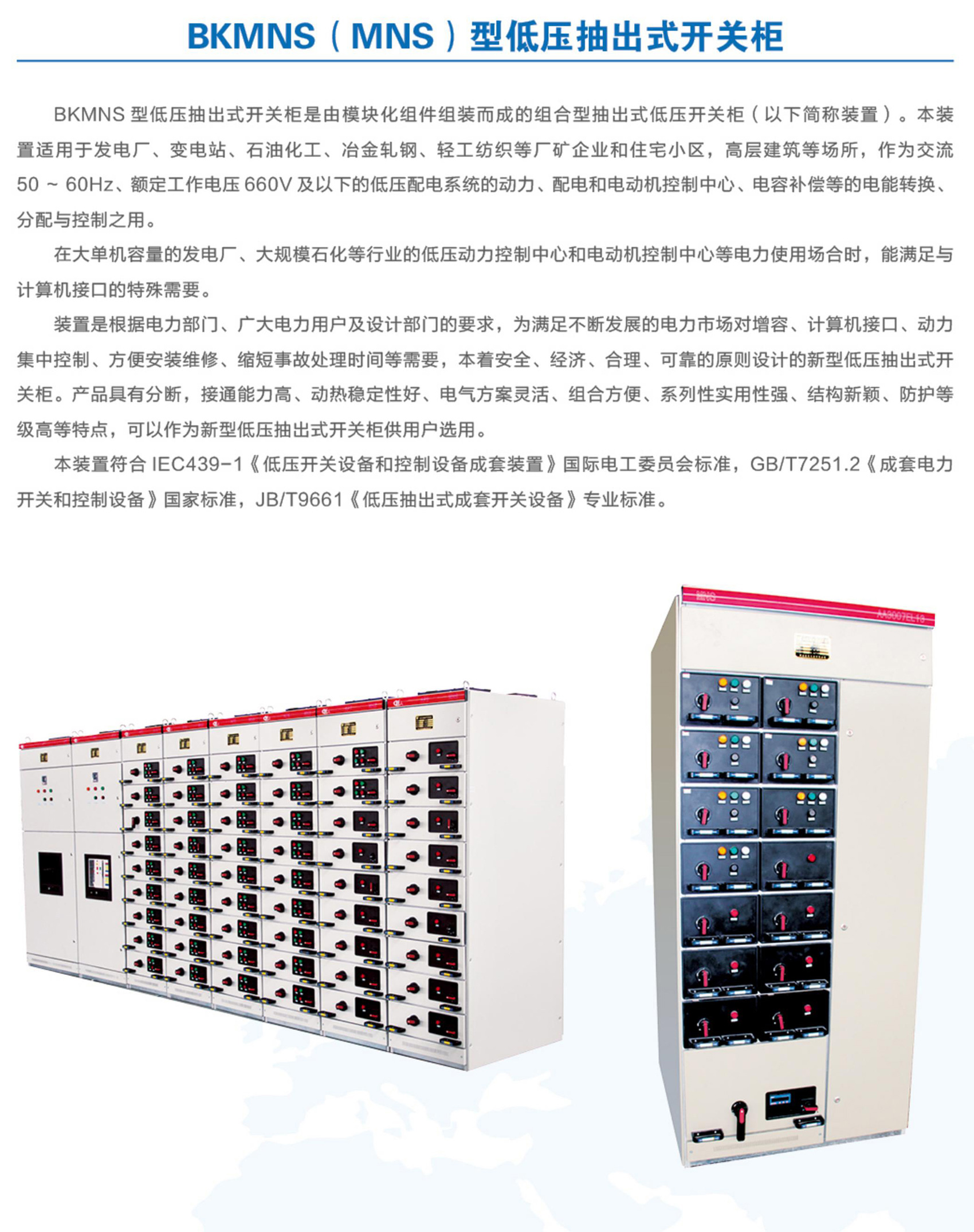 BKMNS 型低压抽出式开关柜是由模块化组件组装而成的组合型抽出式低压开关柜(以下简称装置)。本装置适用于发电厂、变电站、石油化工、冶金轧钢、轻工纺织等厂矿企业和住宅小区,高层建筑等场所,作为交流50~60Hz、额定工作电压660V及以下的低压配电系统的动力、配电和电动机控制中心、电容补偿等的电能转换、分配与控制之用。在大单机容量的发电厂、大规模石化等行业的低压动力控制中心和电动机控制中心等电力使用场合时,能满足与计算机接口的特殊需要。装置是根据电力部门、广大电力用户及设计部门的要求,为满足不断发展的电力市场对增容、计算机接口、动力集中控制、方便安装维修、缩短事故处理时间等需要,本着安全、经济、合理、可靠的原则设计的新型低压抽出式开关柜。产品具有分断,接通能力高、动热稳定性好、电气方案灵活、组合方便、系列性实用性强、结构新颖、防护等级高等特点,可以作为新型低压抽出式开关柜供用户选用。